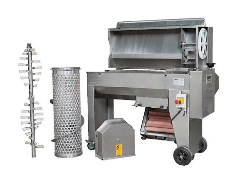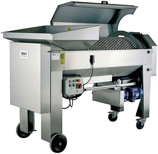Młynek ze stali nierdzewnej z silnikiem 3-fazowym (bez pompy), sitem ze stali nierdzewnej i wałem do odszypułkowywania winogron. Rama wykonana z wytrzymałego profilu ze stali nierdzewnej. Maszyna zawiera również dwa regulowane gumowe walce zgniatające, zapewniające bardzo delikatne rozdrabnianie winogron. Centralna część jest odchylana, co ułatwia czyszczenie. Kółka ułatwiają obsługę. Maszyna nadaje się do produkcji win najwyższej jakości. Standardowy kosz wykonany jest ze stali nierdzewnej. Na życzenie klienta kosz może być wykonany z materiału moplen. Ponadto, zgodnie z życzeniem klienta, mogą być wykonane różne wersje perforacji kosza ze stali nierdzewnej. Regulowane gumowe rolki są ruchome z możliwością regulacji mycia.Stojak zawiera również wannę ze stali nierdzewnej na zmiażdżone winogrona, która jest wyposażona w śrubę ze stali nierdzewnej i holender do podłączenia pompy zacieru. Jeśli klient zdecyduje się na wersję bez wanny ze stali nierdzewnej, wymagana jest pompa oliwkowa, ślimakowa lub perystaltyczna z naszą pompą zbiorczą