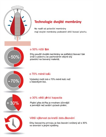 W przeciwieństwie do półmembrany, podwójne membrany mają znacznie większą powierzchnię tłoczenia. W związku z tym, pozwalają one na kontrolowany wypływ soku przy jednoczesnym zachowaniu maksymalnej oszczędności dzięki niższemu równomiernemu ciśnieniu wywieranemu na tłoczony materiał.